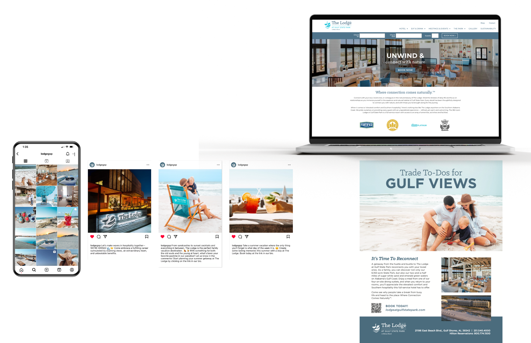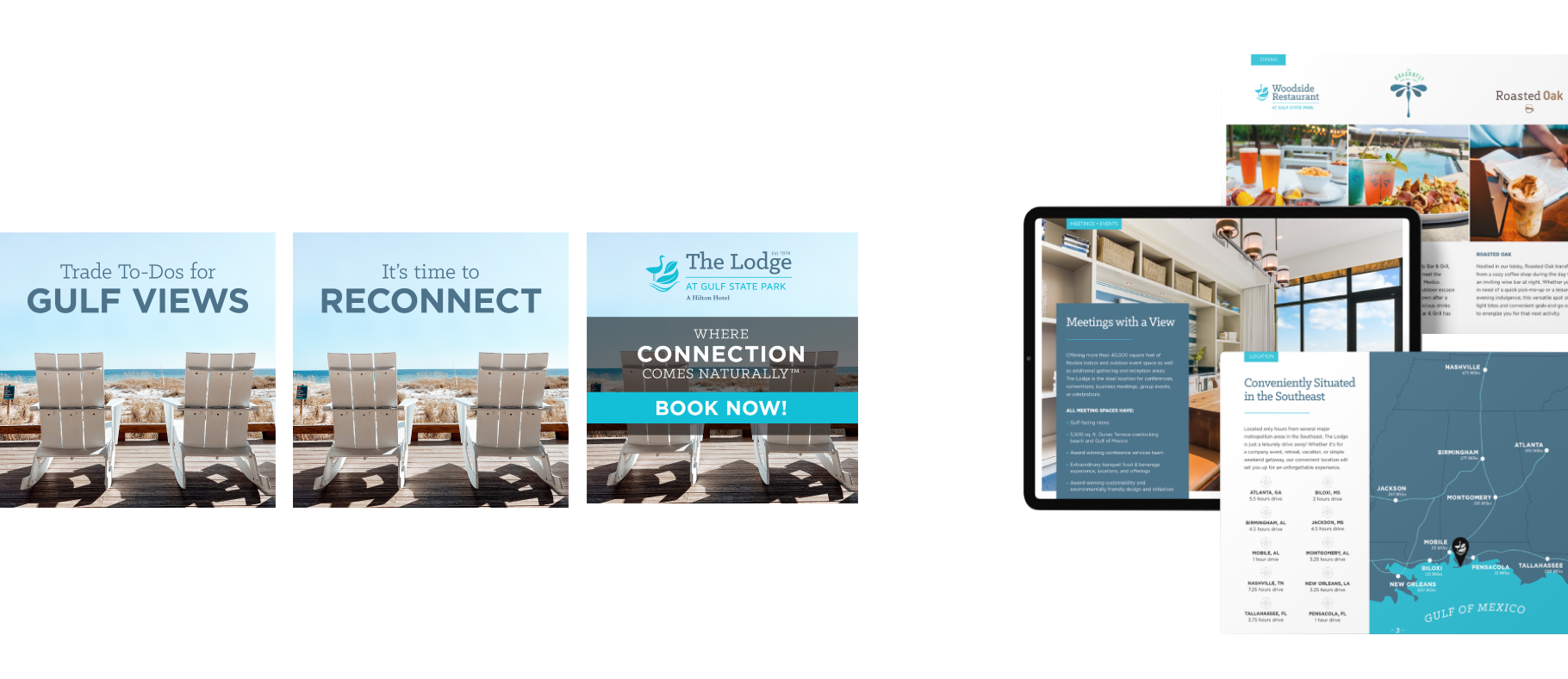 Hotel-focused creative showcased the full-service, eco-friendly resort immersed in its stunning natural habitat — paired with a clear call to book a stay. Restaurant placements highlighted fresh, local cuisine, craft beverages, and sweeping Gulf views — driving direct reservations.